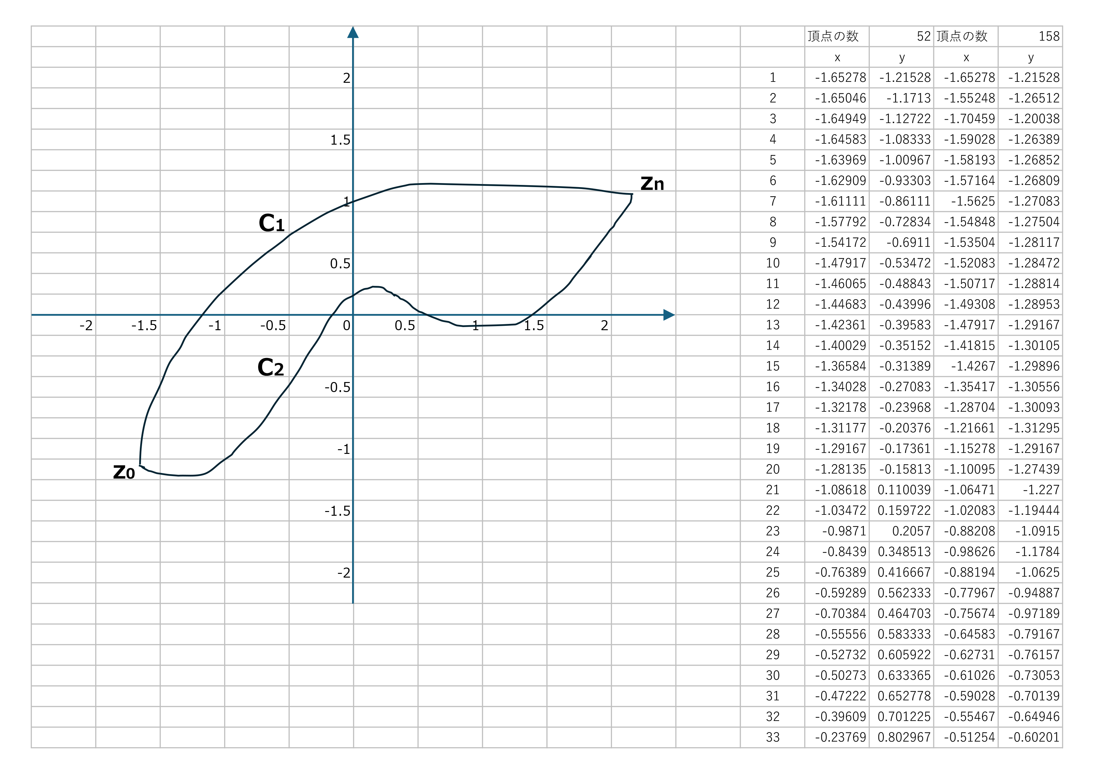 VBAマクロを仕込んだExcelファイルはZIPでダウンロードできるようにしていますが、Sheet1は下図のようになっています。左側には複素平面の座標軸が示され、フリーハンド曲線\(C_{1}\)と\(C_{2}\)が描かれています。\(C_{1}\)も\(C_{2}\)も始点は\(z_{0}\)で終点は\(z_{n}\)です。右側には数値が並んでいますが、\(C_{1}\)と\(C_{2}\)の頂点の座標になります。一番上には頂点の数が示されていますが、\(C_{1}\)と\(C_{2}\)では頂点の数が異なります。これはExcel自身のアルゴリズムで曲線を近似するのに最適な頂点数が選ばれているものと考えられます。頂点の座標は複素平面の座標軸に付した目盛りに対応しています。