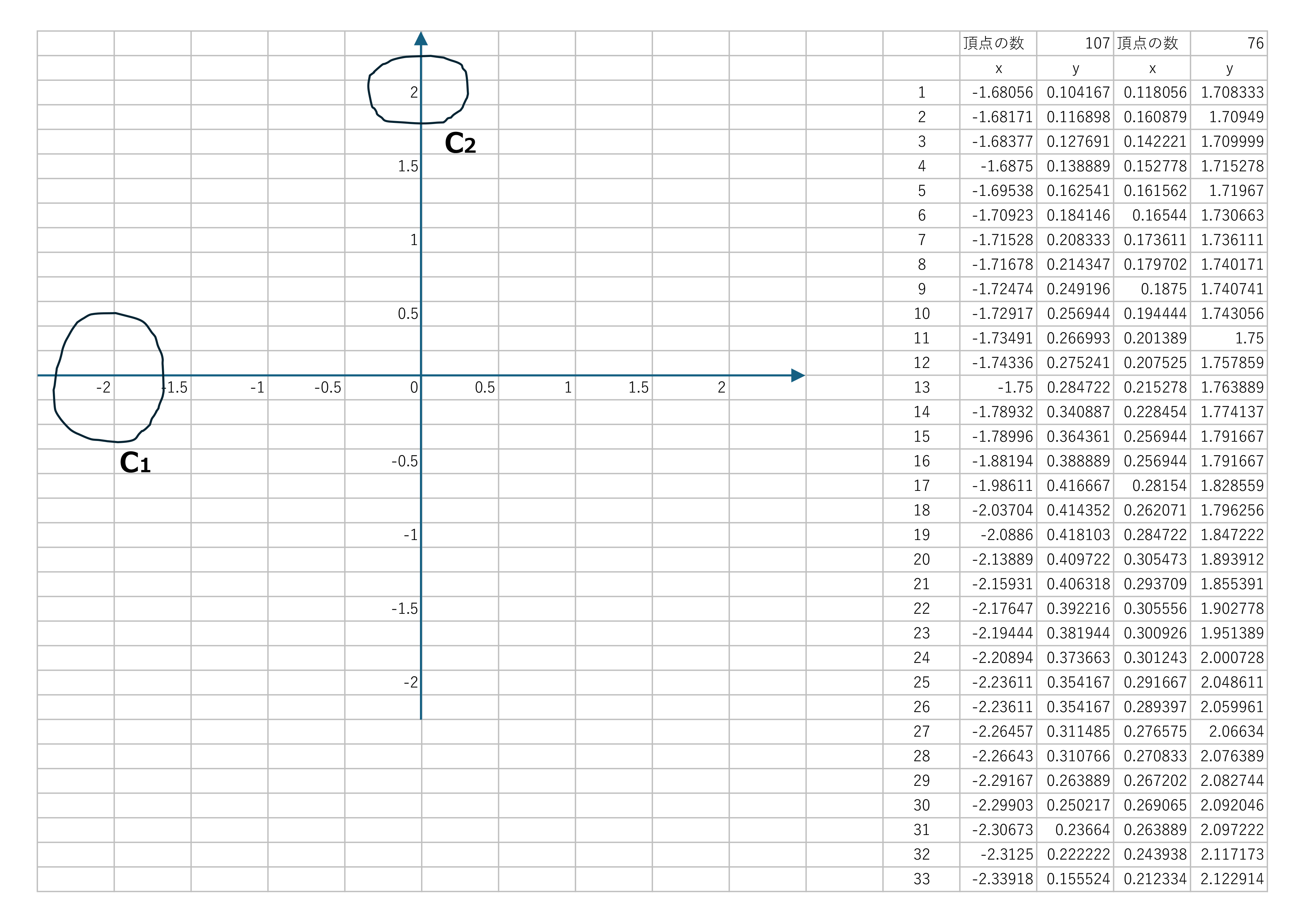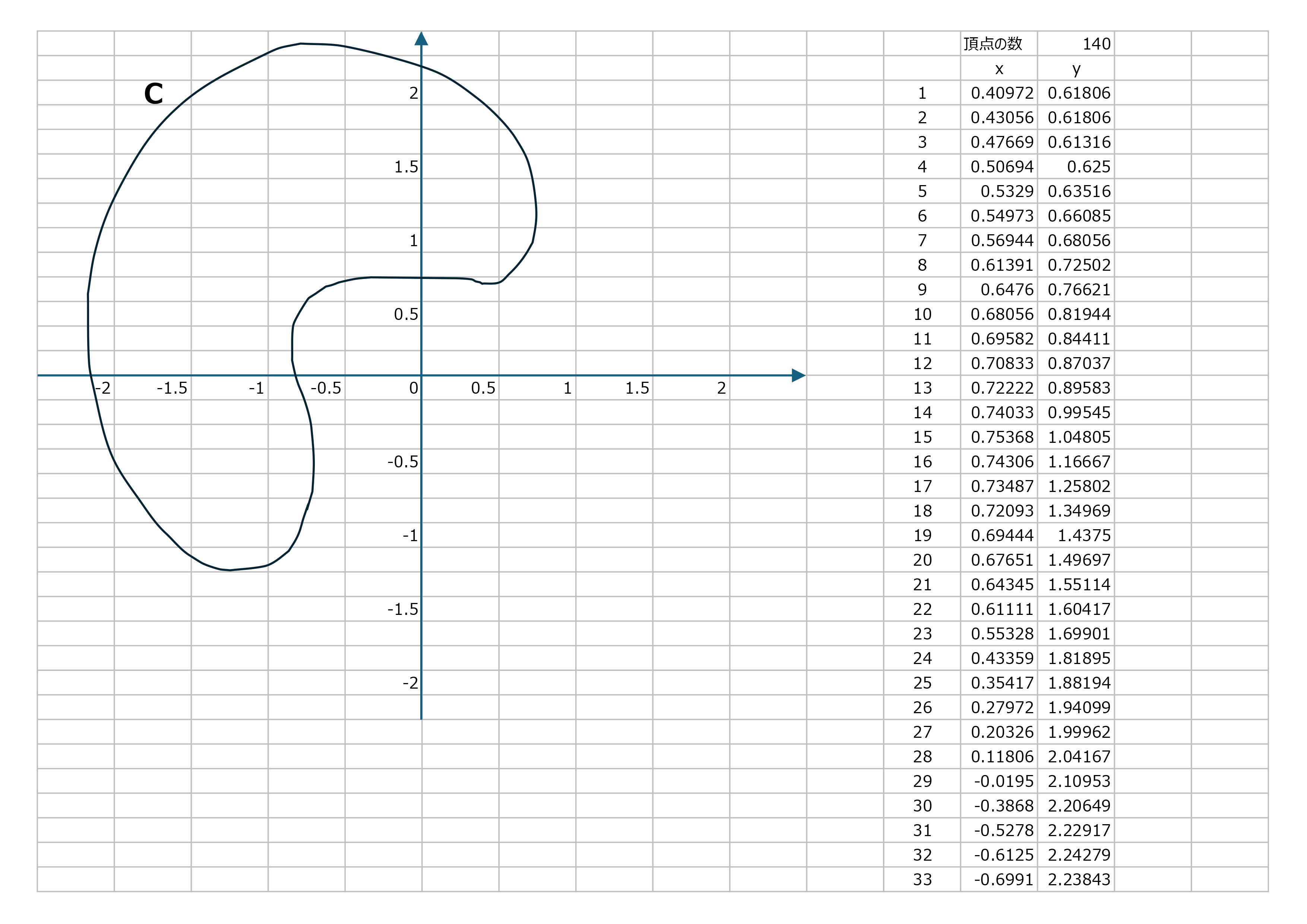 下図はZIPでダウンロードできるcurve2num.xlsmのSheet2になりますが、今回用いる積分経路はこの閉曲線\(C\)です。「4.1 フリーハンド曲線の頂点の座標取得」で紹介したVBAマクロ「Sub 第1曲線頂点()」をそのまま使って頂点の座標を取得しています。ここでは、被積分関数